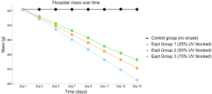 \[ \large{\textbf{IOHOIHEF}} \\ \small \begin{array}{|c|c|c|c|c|c|c|c|c|} \hline \text{Condition} & \text{Day 1} & \text{Day 3} & \text{Day 5} & \text{Day 7} & \text{Day 9} & \text{Day 11} & \text{Day 13} & \text{Day 15} \\ \hline \begin{array}{c}\textbf{Control Group} \\ \text{(no UV blocking)}\end{array} & 421.98 & 422.01 & 422.00 & 421.99 & 421.97 & 421.99 & 422.03 & 421.98 \\ \hline \begin{array}{c}\textbf{Experimental Group 1} \\ \text{(25% UV blocking)}\end{array} & 422.03 & 412.33 & 402.53 & 392.73 & 382.93 & 371.13 & 361.96 & 352.88 \\ \hline \begin{array}{c}\textbf{Experimental Group 2} \\ \text{(50% UV blocking)}\end{array} & 422.07 & 410.53 & 399.03 & 387.53 & 376.03 & 364.53 & 352.88 & 341.38 \\ \hline \begin{array}{c}\textbf{Experimental Group 3} \\ \text{(75% UV blocking)}\end{array} & 422.21 & 408.20 & 394.37 & 380.54 & 366.71 & 352.88 & 339.05 & 325.22 \\ \hline \end{array} \]