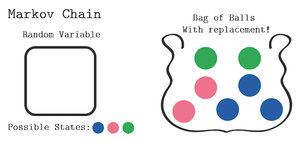 A variant of the same question asks once again for ball color, but it allows replacement each time a ball is drawn. Once again, this creates a stochastic process with color for the random variable. This process, however, does satisfy the Markov property. Can you figure out why?